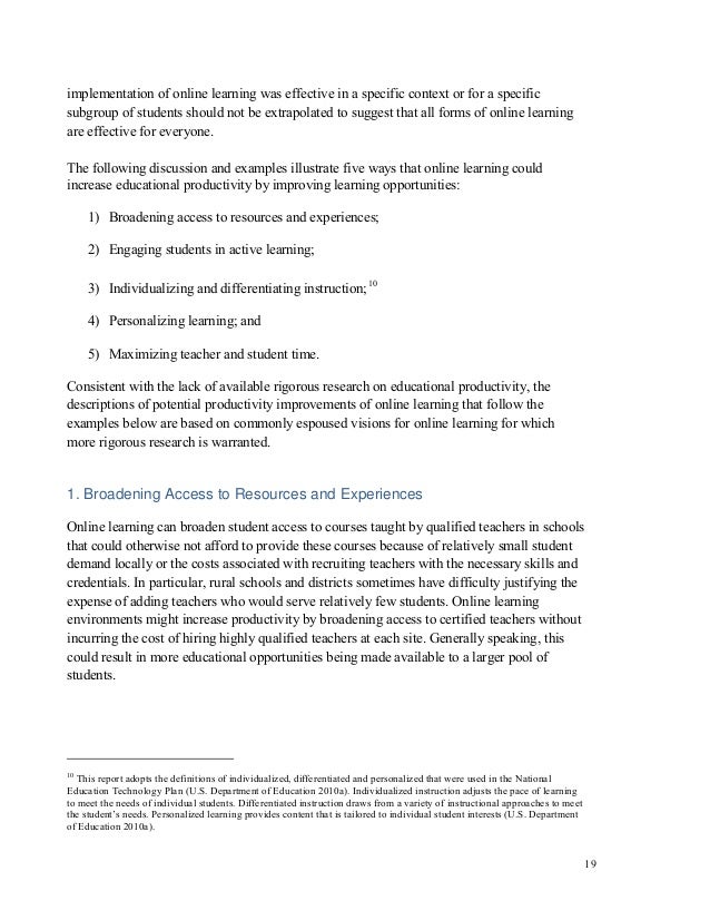 Mar 20, 2012 · nine applications of online learning …are seen as possible pathways to improved productivity: How to enhance the learning process in online education? Understanding the implications of online learning for educational productivity.” office of educational technology, us department of education, 2012. The us department of education released a report called “understanding the implications of online learning for educational productivity” this past january.